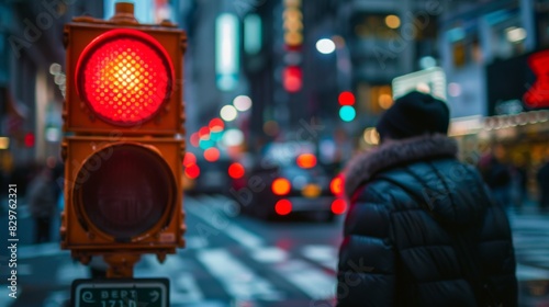 A pedestrian waiting at a crosswalk with the pedestrian signal showing red, with shops and traffic in the background.