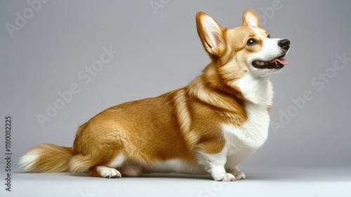 A Pembroke Welsh Corgi sits momentarily on a white background, short legs tucked neatly under, its happiness contagious