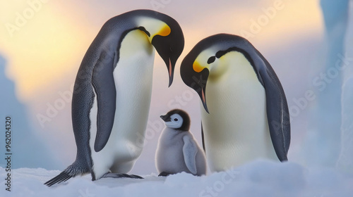 A penguin family standing together on the ice, the chick nestled safely between the parents