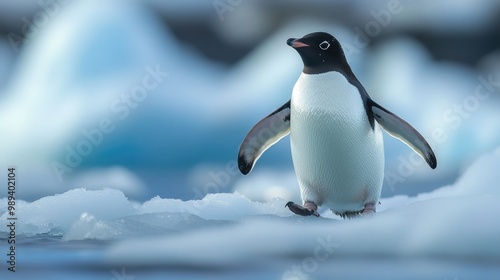 penguin, antarctica, ice, snow, water, wildlife, animal, bird, black, white, cute, standing, looking, adorable, glacé, ocean, wilderness, nature, south, pole, cold, landscape, background, feather, beak, eye, wing, foot, leg, blue, sea, fluffy, freeze, polar, antarctic, fauna, wild