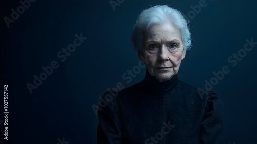 A pensive and melancholic portrait shot of an elderly woman dressed in a timeless black mourning gown captured against a plain navy blue studio background with dramatic lighting and negative space