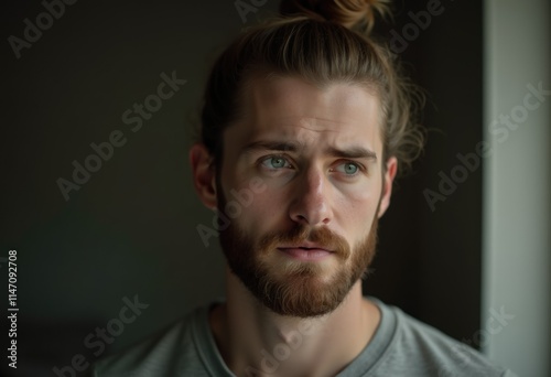man, male, portrait, face, beard, hair, long hair, bun, thoughtful, pensive, contemplative, serious, expression, emotion, eye, blue eye, skin, complexion, fashion, style, model, photogenic, attractive, guy, young, adult, indoor, closeup, lighting, shadow, grey shirt, coiffure, facial hair