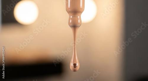 foundation, make-up, cosmetic, liquid, dripped, droplet, dropper, pipette, serum, fluid, product, essence, substance, oil, emulsion, lotion, cream, dripping, falling, dropping, pouring, applying, testing, sampling, macro, closeup, detail, glossy, shiny, smooth, viscous, texture, surface, bokeh, blur, background, studio, lighting, warm, highlight, minimalist, clean, elegant, centered, beige