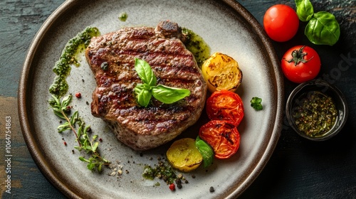 A perfectly grilled steak sits on a rustic plate, surrounded by roasted tomatoes and herbs, adding a touch of freshness to a hearty meal, ideal for a cozy evening
