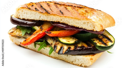 perfectly, grilled, vegetable, sandwich, ciabatta, bread, aubergine, courgette, bell, pepper, provolone, cheese, each, vibrant, colours, subtile, captured, precision, set, isolated, white, background, highlight, vegetarian, delight
