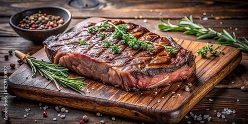 steak, meat, beef, food, grilled, cooking, culinary, delicious, savoury, protein, dinner, meal, rustic, wooden, chopping board, seasoning, salt, pepper, rosemary, herb, spice, kitchen, food photography, epicure, cookery