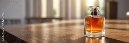 A perfume bottle rests on a wooden table in the soft morning sunlight, wood grain texture , luxurious decorative items, fragrant delights