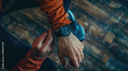 A person adjusting their fitness watch before starting a workout or exercise routine , wide background