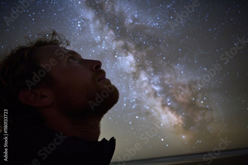 man, star, sky, astronomy, celestial, cosmos, night, darkness, contemplation, thoughtful, person, individual, alone, nature, outdoors, landscape, scenery, beauty, wonder