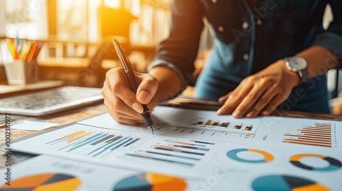 A person analyzing and writing on financial reports with charts and graphs in a professional setting.