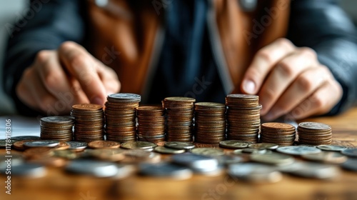 A person arranging stacks of coins on a table, illustrating financial organization.