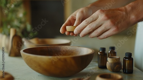 a person carefully working with wooden bowls and small vials, showcasing hands with various tools, evoking a sense of craftsmanship and mindfulness
