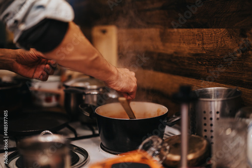 A person cooks on a stove with steaming pots in a warm, rustic kitchen setting. The atmosphere reflects a relaxed and homely vibe, highlighting the enjoyment of preparing homemade food.