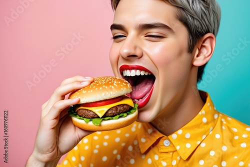 burger, food, eating, person, face, mouth, closeup, happy, delicious, tomatoes, cheese, lettuce, sesame, bun, beef, meal, lunch, appetence, satisfaction, enjoyment, joy, cheeseburger, fast food, expression, portrait, smile, tongue, open mouth, bite, yellow, shirt, pink, blue, background, healthy eating, diet, calorie, eatery, take-away, client, consumer, white, teeth, appetising, fresh, style, model, hair, make-up