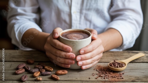 chocolate, drink, cup, cocoa, hot, table, hand, food, spoon, bean, wooden, person, cocoa, sweet, warm, winter, closeup, healthy, ingredient, beverage, mug, woman, lifestyle, nourishment, breakfast, delicious, homemade, organic, powder, raw