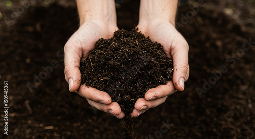 A person holding a handful of dark soil with both hands over a background of more dark soil ground