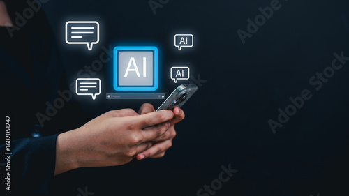 A person holding a smartphone with digital AI chat bubbles and icons floating, symbolizing artificial intelligence communication.