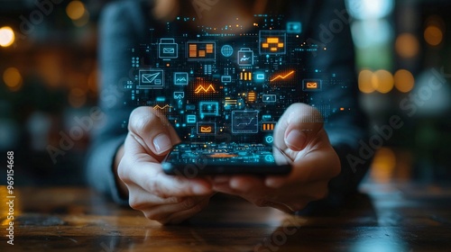 person, holding, smartphone, floating, holographic, icon, act, modern, financial, service, money