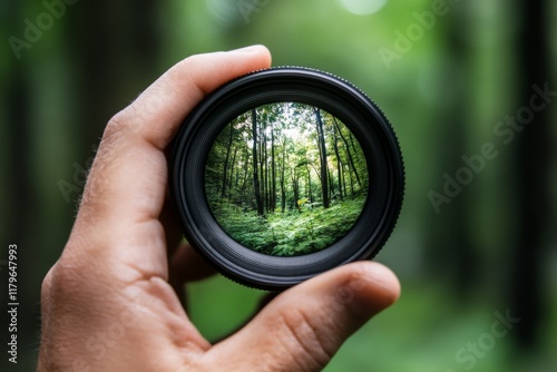 A person holds a camera lens, capturing a vibrant forest scene through it, blending nature and photography.
