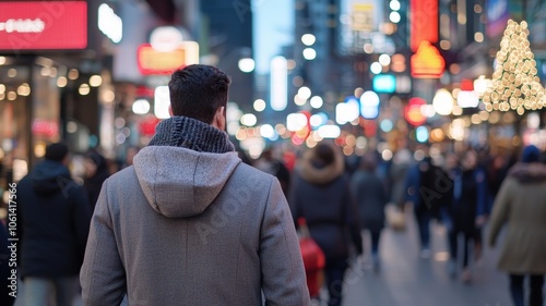 A person in a gray coat walks through a bustling city street decorated with bright lights and surrounded by a crowd.