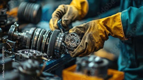 A person in gloves works on mechanical gears and parts in a workshop, showcasing a focus on precision and craftsmanship.