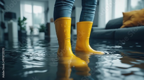 A person in yellow rain boots stands in a flooded living room