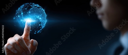 A person interacts with a glowing digital globe made of interconnected lines, symbolizing technology and global connectivity.