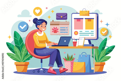 computer, online shopping, product, searching, desk, workspace, plant, woman, laptop, home office, browsing, illustration, technology, web, e-business, shopping cart, decorative, colourful, item, productivity, consumer, purchase, digital, customer service, aesthetic, creative, lifestyle, cheerful, hipster, modern, stylish, scheme, casual attire, design, commercial, interface, organised, branding, desktop, layout, happy