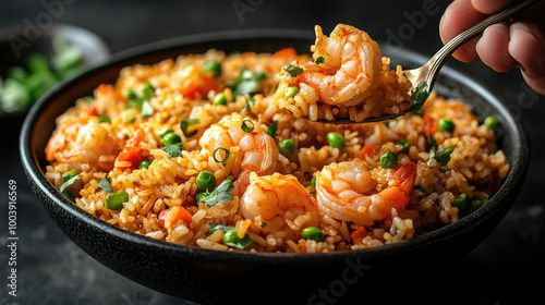 person, white, red, healthy, style, chinese, eating, fish, green, oriental, pink, eatery, tomatoes, pea, background, asian, spoon, dinner, food, fresh, lunch, vegetable, meal, onion, traditional, pepper, prawn, using, asia, egg, plate, chopstick, epicure, seafood, sauce, dish, shrimp, tasty, cooked, cookery, rice, delicious, fried, thai, fried rice
