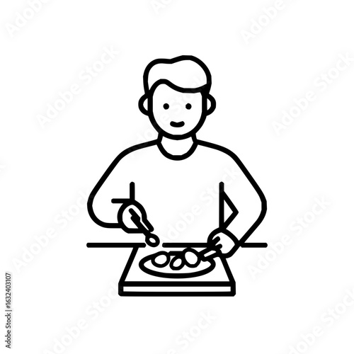 person, eating, meal, table, utensil, black, white, line, drawing, style, food, plate, fork, spoon, man, dinner, lunch, breakfast, cookery, eatery, diet, nourishment, healthy, lifestyle, human, character, illustration, graphic, outline, minimalist, simple, design, icon, clip art, vector, image, art, dish, eat, dining, cutlery, tableware, individual, single