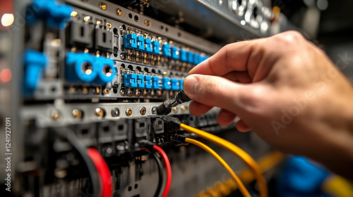 A person is working on an electrical panel, connecting wires and adjusting circuit breakers, showcasing electrical maintenance and installation tasks.