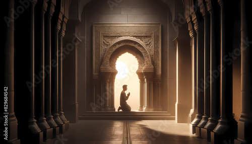 serenity, solitude, prayer, kneeling, archway, golden light, spirituality, peace, meditation, calm, architecture, arch, pillar, warm light, inner peace, contemplation, divine, spiritual, calmness, reverence, quiet, sanctuary, sacred, devotion, worship, ornate, harmony, illumination, aethereal, serene, glow, faith, religious, mindfulness, elegance, quietude, introspection, heritage, cultural, timeless, stillness, mystical