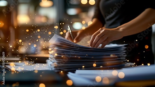 A person organizing paperwork on a desk with a warm, glowing atmosphere.