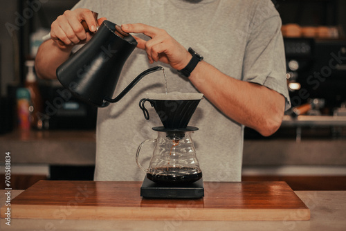 A person pouring hot water from a black kettle into a coffee dripper on top of a clear glass carafe