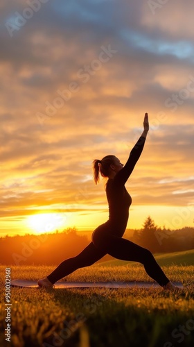 A person practicing yoga in a serene outdoor setting at sunrise, finding peace and balance through mindful movement, with a focus on the tranquility of the moment