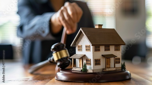 A person reaching for a miniature house model placed beside a gavel on a wooden desk, symbolizing issues of home ownership, legal matters, or real estate auctions.