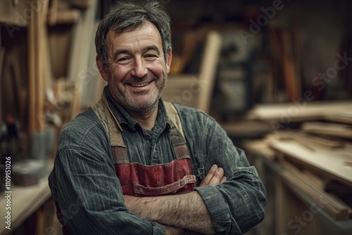A person standing in a woodworking shop with their arms crossed, surrounded by tools and wood materials