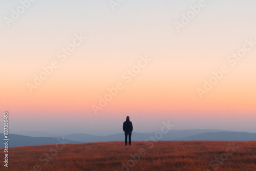 person, alone, hillside, looking, horizon, sky, beautiful, pink, sunset, orange, mix, hue, serene, peaceful, nature, creating, atmosphere, silhouette, landscape, summer, sunrise, man, lifestyle, freedom, travel, sun, young, field, mountain, background, adult, standing, dusk, adventure, male, success, sunlight, leisure, walking, outdoors, hiking, evening, 1, view, vacation, active, concept, light, countryside