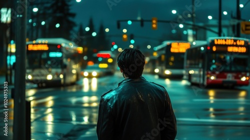 person, city, bus, stop, traffic, light, evening, urban, transportation, street, leather, jacket, waiting, movement, vehicle, glow, atmosphere, solitude, journey, commute, architecture, road, pedestrian, shadow, rain, wet, night, neon, signal, landscape, transit, crowd, city landscape, travel, lifestyle, environment, scene, motion, urbanity, twilight, ambience, public, transport, bustling, energy, dynamic