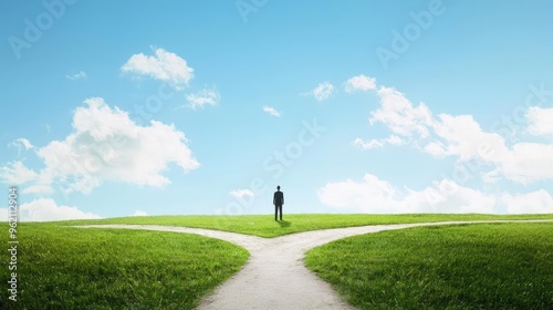 A person stands at a crossroads, contemplating choices in a serene landscape under a clear blue sky.