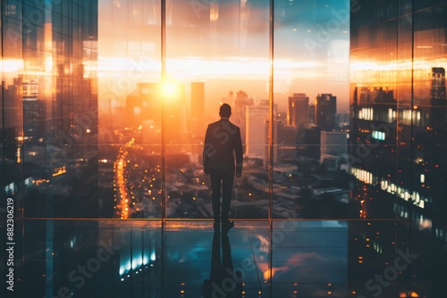 A person stands in a modern glass building, gazing at the city skyline during a sunset, symbolizing contemplation.