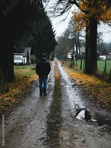 A person stands on a lane. There are trees on both sides. Some leaves on the ground. There is a puddle on the lane. There are buildings visible in the background.