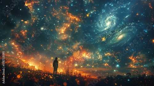 A person stands silhouetted against a star-filled, colorful night sky. Concept of wonder and exploration. For depicting awe and the beauty of the cosmos.