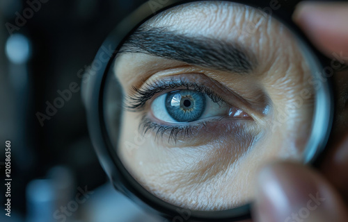 eye, magnifying glass, exam, closeup, detail, indoor, person, blue, vision, zoom, sharpened, lighting, texture, observation, health, anatomy, iris, pupil, eyelash, curiosity, exploration, clarity, optic, science, perspective, feature, human, beauty, gaze, personal, care, inspection, medicals, environment, angle, depth, elation, emotion, precision, perception, artistry, lens, micro, colours, attention, insight, wonder, analysis, investigation