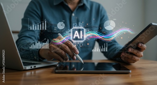 A person using technology to analyze data with AI graphics displayed.