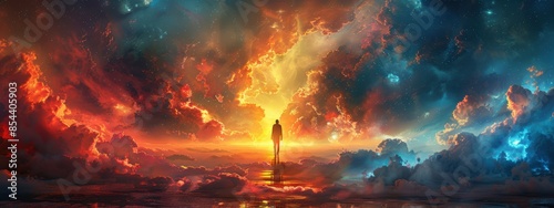 A person walking through a doorway that leads into a fantastical illustrated world.