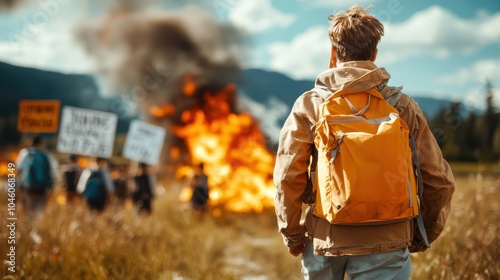 A person wearing a yellow backpack stands in a grassy field, observing a fiery protest scene with signs and smoke, symbolizing activism and the fight for change.