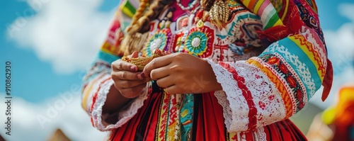 A person wearing traditional colorful ethnic attire holding an object, showcasing cultural heritage and vibrant fabric details.