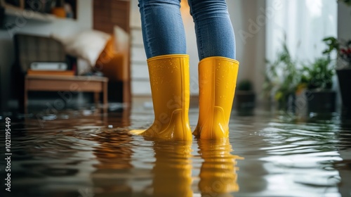 boot, flood, water, room, indoor, yellow, footwear, home, environment, damage, standing, wet, puddle, lifestyle, rainy, weather, disaster, safety, living, furniture, plant, casual attire, jean, moisture, flooding, emergency, ground, interior, space, comfort, shoe, protection, household, situation, storm, scene, urban, atmosphere, design, decor, ambience, nature, element, climate, risk, awareness, crisis, response