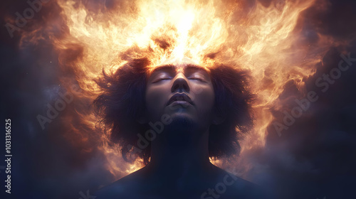 A person with fiery energy emanating from their head, symbolizing creativity.